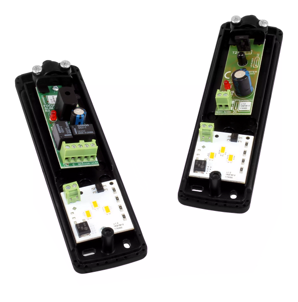 Das schlanke Gehäuse (nur 38 mm breit) ist spritzwassergeschützt (IP‑54) und aus robustem ABS mit Polycarbonat-Abdeckung gefertigt. Die Technik sorgt für hohe Störfestigkeit selbst bei Fremdlicht und erlaubt dank 200° einstellbarem Sichtwinkel flexible Montagemöglichkeiten.